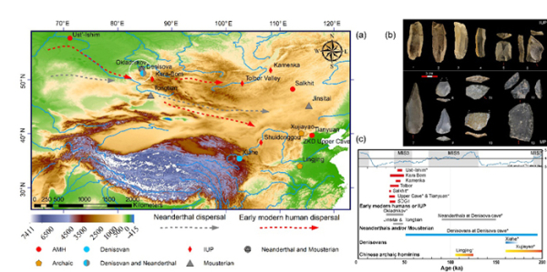 古脊椎所研究员高星团队针对早期现代人“北方扩散路线”这一问题已发表多项研究成果。6月19日,该研究团队在Science Bulletin“研究亮点”(Research Highlight)在线发表了关于早期现代人北方扩散路线的评述。化石人类学、古基因组学、考古学等多方面证据表明,距今约5-3万年间,早期现代人曾沿中亚、西伯利亚、蒙古、中国西北地区等向东扩散(图1)。这一扩散晚于沿南方路线扩散开始的时间(距今约12-8万年),表明早期现代人的扩散是一个复杂过程,在不同时段有不同的扩散路线,并且扩散的机制和动因可能不同。早期现代人在沿北方路线扩散过程中与古老类型人类(尼安德特人、丹尼索瓦人等)有过频繁的基因交流,这揭示出古人类基因交流历史的复杂性。“北方扩散路线”的新研究成果表明,早期现代人的扩散是一个复杂的动态过程,且扩散过程中与不同人群的基因交流可能是常态,这提醒学者在讨论我们的直接祖先——现代人的起源和演化时,应更重视区域复杂性和基因交流的频发性。