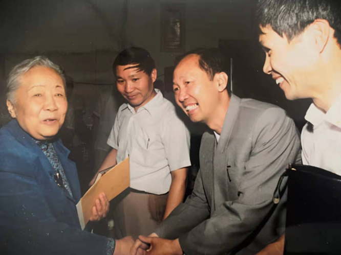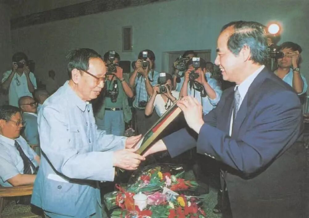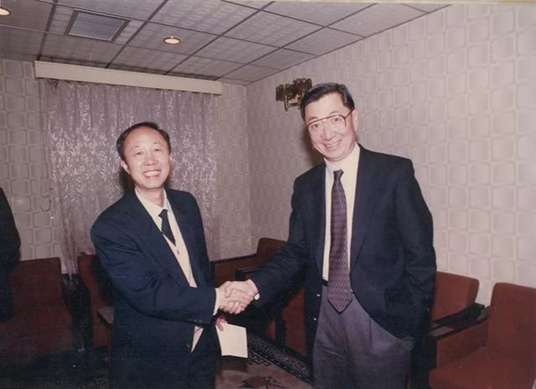 20世纪80年代末丁肇中访问高能物理所时与郑志鹏亲切握手