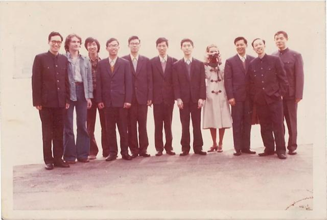 1978年,郑志鹏刚到DESY不久后中国同事与组内同事的合影(从右至左:马基茂,郑志鹏,杨保忠,苏珊马克斯,张长春,郁忠强,朱永生,许咨宗,福岛,让 皮尔,童国梁。唐孝威,吴坚武两位同学没有参加合影留念。摄影者:丁肇中。)