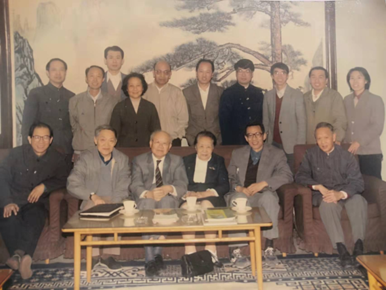 1988年袁家骝、吴健雄夫妇与访问高能所新一届领导班子和工程经理座谈(第一排左起谢家麟、叶铭汉、袁家骝、吴健雄、方守贤、郑林生。后排左起李德中、郑志鹏、王津、王迪、石寅生、徐绍旺、马彤军、陈森玉、章炎、王恒久)