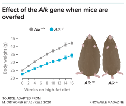 图3:遗传因素在天生体瘦中起着重要作用,研究人员正逐步识别相关基因。在小鼠实验中,删除其中某个名为Alk的基因后,即使喂食高脂肪饮食,实验鼠仍能抵抗体重增加。