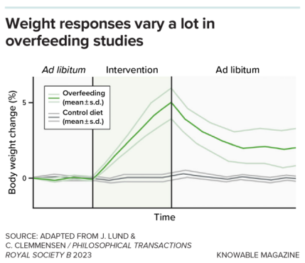 图1:在经历阶段性过量进食后,人体通常会出现体重回落。但如图所示,个体对过量进食的反应程度以及回归"正常"体重的速度均存在差异。(“Ad libitum” 指实验中参与者可自由选择食物的阶段。)