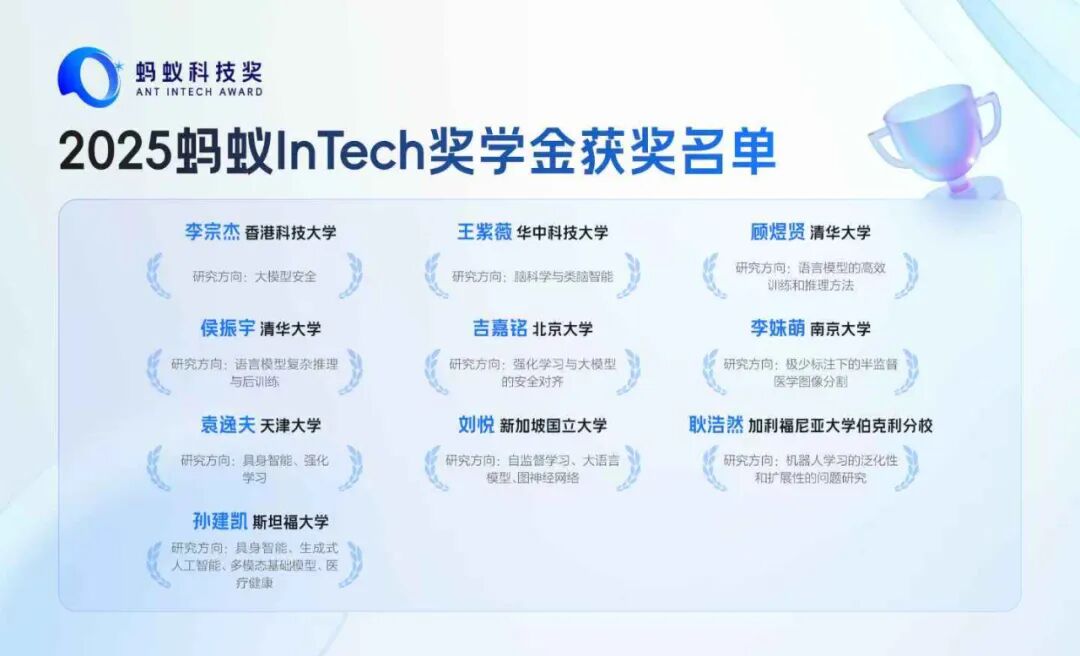 今年的蚂蚁InTech科技奖又全面升级,除了继续遴选10位青年学者,提供20万元/人的“科技奖”资助外,还首次增设了5万元/人的博士生“奖学金”,提供对“青年学者-博士生”的全周期支持。本届整体参评规模达去年3倍,海外申报者占比超20%,其中包括牛津、耶鲁、斯坦福等高校。