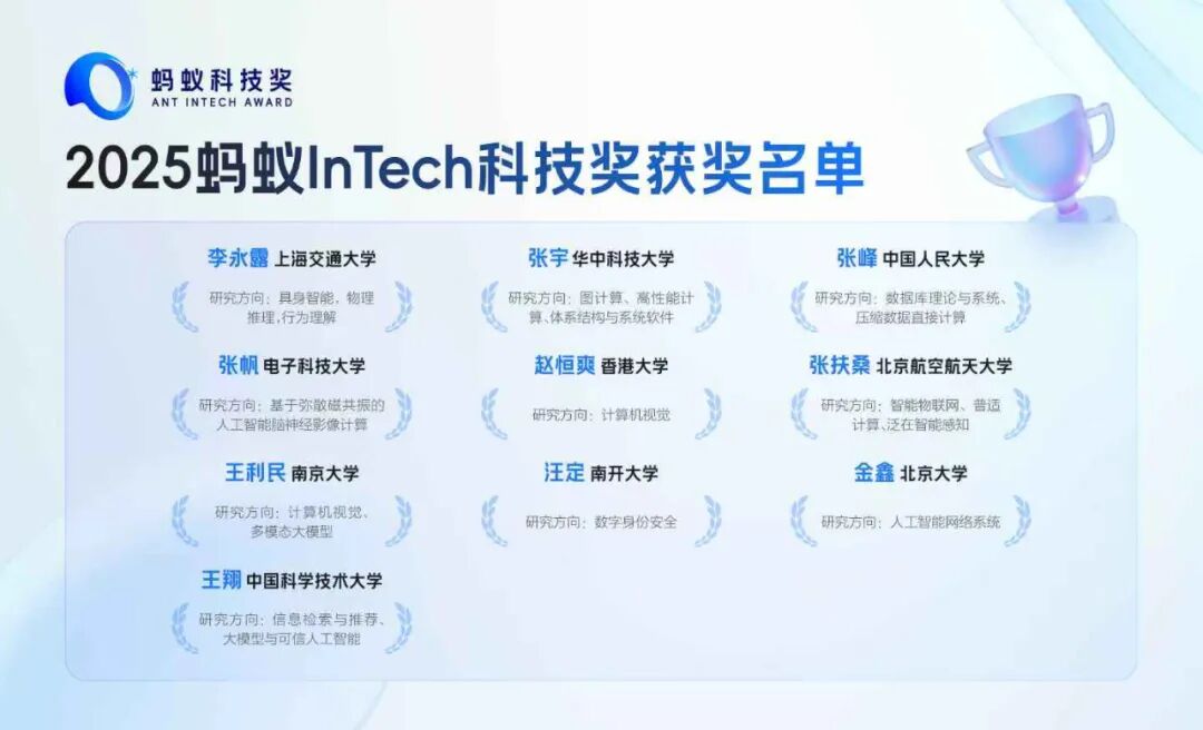 在这样的背景下,蚂蚁集团自去年开始设立InTech科技奖,它并非面向成熟的科学巨擘,而是将目光投向科研曲线尚在上升阶段的青年学者。
