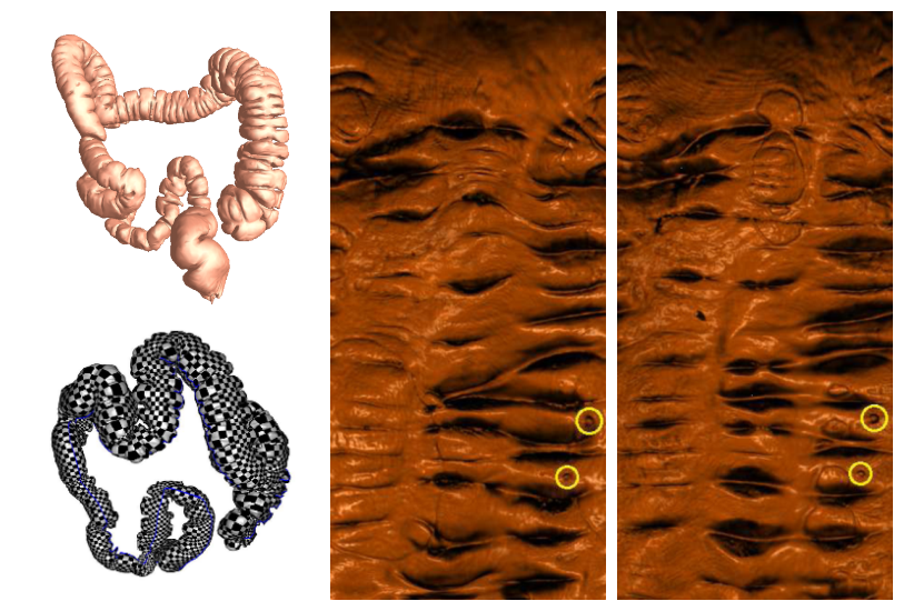 读者们可能很难想象,微分几何这样的纯数学在图像处理中也发挥着巨大作用。传统的肠镜检查往往给病人带来痛苦和不适,让人望而却步。而虚拟肠镜技术利用CT扫描获得断层图像,经过分割和三维重建,即可得到肠子的三维模型。在物理上类似于把肠子给切割、抻开,从而在二维平面上进行病理检测。这种技术就是利用了数学的里奇流作为工具将弯曲的曲面保角地变换到平面上。