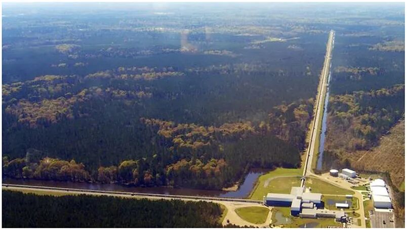图4 LIGO引力波探测器(美国路易斯安那州利文斯顿)。两个引力波探测器之一的鸟瞰图,该探测器在2015年史上首次探测到了引力波。每个LIGO探测器由两条臂组成,每条臂长4公里(2.5英里),由两个1.2米宽的钢制真空管排列成 "L"形,并被3米宽、3.7米高的混凝土罩覆盖,保护真空管不受环境影响。LIGO可以探测到来自任何方向的引力波,甚至是从下方来的引力波(图源:加州理工学院/LIGO实验室)。