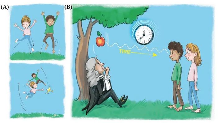 图1 牛顿成功的引力理论具有不少局限。(A) 你有没有想过,为什么当你跳起来之后会落回地球,而不是飞向天空?是什么吸引你回到地球?牛顿理论无法回答这个问题。(B) 当一个苹果从树上掉下来时,观察者需要时间才能知道这个事情的发生,因为信息是以光速传播的。牛顿理论假设了观察者在苹果落下的同一时刻看到它瞬间落下。这两个局限都被爱因斯坦的引力理论解决了。