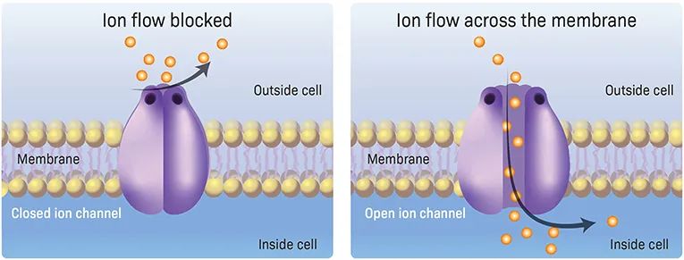 图2 神经细胞膜中的离子通道。离子通道(紫色)是由蛋白质构成的“孔”,位于神经细胞膜上。突触后细胞(见图1)上的离子通道通常是关闭的(左图),在接收突触前细胞释放的神经递质时打开(右图)。膜离子通道的开放使离子(橙色球)能够穿过膜,这是神经细胞产生电活动的基本机制。