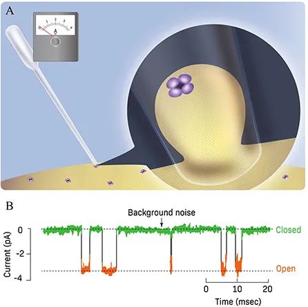 我们发现,当环境中不存在神经递质时,没有电流通过离子通道,只能观察到轻微的背景噪音(图3B)。当神经递质与膜受体结合之后,离子通道迅速呈阶梯状打开,让几皮安的微小电流穿过细胞膜(1皮安为10-12安培)[2-4]。信号接收细胞释放神经递质之后,离子通道随之关闭(图3B)。