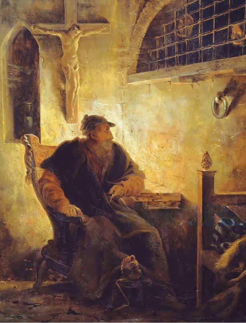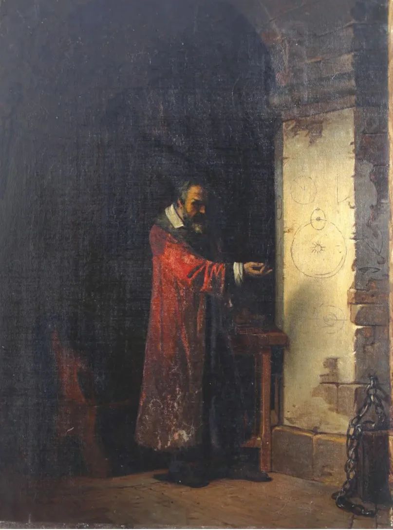 确实,在18—19世纪,随着启蒙运动的发展,伽利略受到宗教裁判所判刑的故事被人们作为宗教压制科学、神权压制理性的典型事件加以宣传,备受关注,一时间涌现出很多反映这一事件的艺术作品[4],狱中的伽利略也变成了一个颇有吸引力的题材。1822年前后,法国画家劳伦特(Jean-Antoine Laurent,1763—1832)就创作了一幅《狱中的伽利略》(图4),作品被始建于1821年的法国多勒精细艺术博物馆(Musée des Beaux-Arts de Dole)收藏。始建于1835年的意大利帕维亚市民博物馆(Musei Civici di Pavia)也收藏有一幅同样题材的油画(图5),作者是意大利画家本内韦罗(Cesare Della Chiesa di Benevello,1788—1853)。两张画中也都出现了伽利略手拿绘图工具(前一幅画中是钉子,后一幅画中是圆规),看着墙上的日心地动模型的场景。由此可以看出,利维奥的质疑确实是有道理的,他所讨论的那两幅《狱中的伽利略》油画看来就是在这样的背景下产生的。只不过这样一来,伽利略生前是否真的说过那句名言的事情又变成了一个历史谜案。