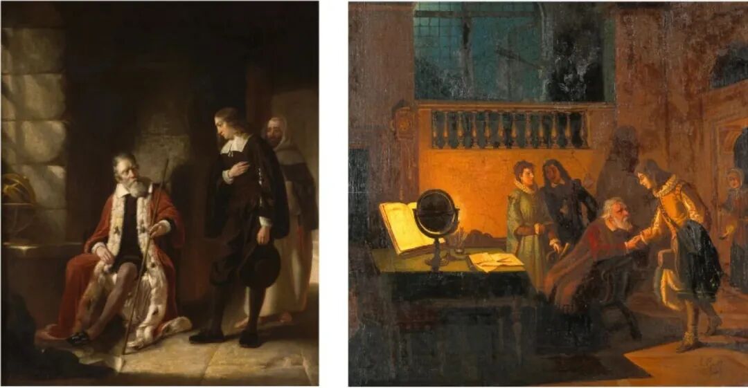 图7(左)卢西《弥尔顿会见伽利略》;图8(右)伽蒂《伽利略接待弥尔顿》