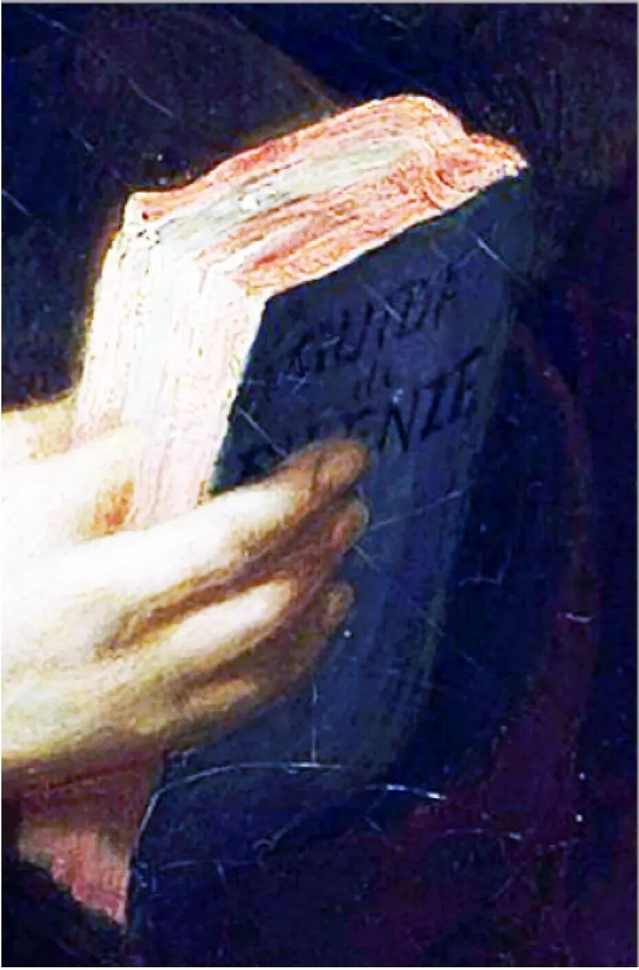 在这类作品中,最值得一提的是英国皇家艺术学院院士哈特(Solomon Alexander Hart,1806—1881)在1847年完成的油画《弥尔顿访问宗教裁判所的囚徒伽利略》(Milton Visiting Galileo when [He Was] a Prisoner of the Inquisition,图11),该画现藏英国维尔康图书馆。画面中,弥尔顿刚刚走进由狱卒打开的牢门。从装束来看,这位狱卒是一位天主教修士,手里拿着两把巨大的牢门钥匙。弥尔顿右手拿着一本书,书名是意大利文GUIDA di SCIENZE,也就是《科学指南》(图12)。弥尔顿的食指插在书里的某个页面之间,显然是准备就那一页的问题向伽利略讨教,请他提供“科学指南”。同弥尔顿急切前趋的动态相对照,伏案工作的伽利略右手拿着圆规正在静静地进行度量,完全沉浸在思考之中。背景的墙上同样画着一个日心说的模型(图11局部),画得有点隐晦——其中的大圆上没有画出地球,但通过左下角的满月和与它相对180°的地方的弯月,暗示了大圆其实是地球的绕日轨道。之所以画得这么隐晦,应该是为了反应此时伽利略已被迫对日心说保持禁声的事实。墙边的柜子上摆着一架望远镜,目镜朝上,物镜朝下(图11局部),可能暗示伽利略已经长久未用它进行观测。望远镜后的墙上则挂着意大利画家提坦(Tiziano Vecelli,一般被称为Titan,约1488/9—1576)的油画《刺杀殉道者圣彼得》(The Assassination of Saint Peter Martyr)(图11局部)。画的主题是关于意大利北部隆巴蒂州(Lombardy)的宗教裁判官彼得(Peter of Verona,画面中倒地的那位,死后被追封为殉道者圣彼得,1205—1252)的故事,他因在布道中公开将东正教斥为异端而被该派教徒刺杀。哈特把它放在这里,当然大有深意。