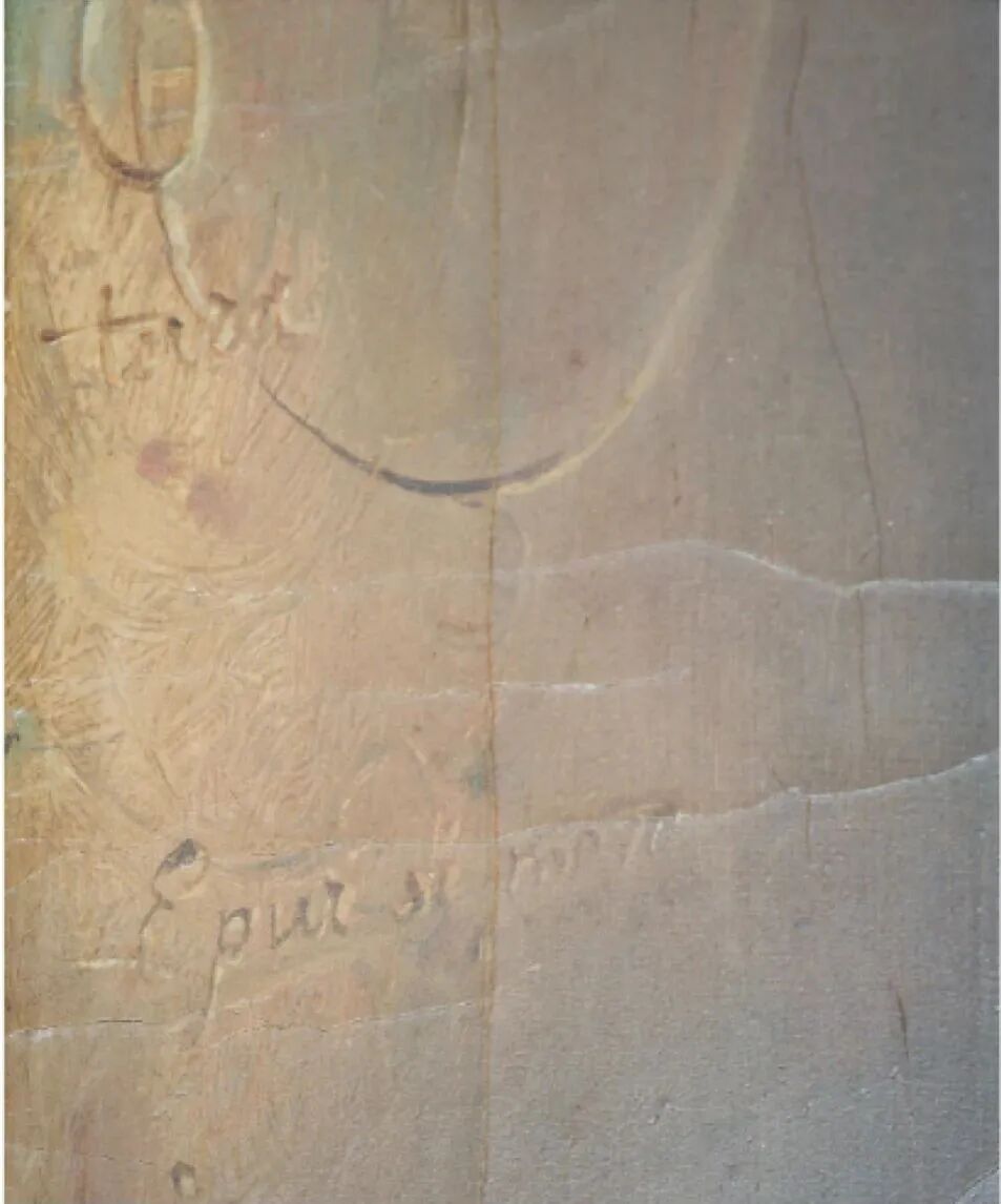 对于这个故事的真实性,费瓦罗十分怀疑。但是,1911年,他收到一封来自比利时鲁瑟拉勒(Roeselare)的信。发信人范·贝勒(Jules Van Belle)号称:他藏有一幅名为《狱中伽利略》(Galileo in Prison)的油画,作于1643—1645年之间(图2),其中的伽利略手中拿着一根钉子,眼睛看着监室墙壁;最近,他把这幅画送去做清洁,结果发现当初装框时被折起来很大一部分,内容包括墙面上刻着的一幅地球绕太阳运转的简图,下面还有那句著名的E pur si move。根据画上不太清楚的签名,范·贝勒认定画的作者是17世纪的西班牙画家穆瑞罗(Bartolomé Esteban Murillo,1618—1682)。凭着范·贝勒随信寄来的一张照片,费瓦罗彻底打消了自己对上述故事的疑虑,并在几份报纸上发表文章对这幅画的发现加以介绍。后来,著名的伽利略研究权威德雷克(Stillman Drake,1910—1993)也相信了这个说法,并结合伽利略的囚禁过程,对这幅画产生的时间和背景做出了进一步的推想。