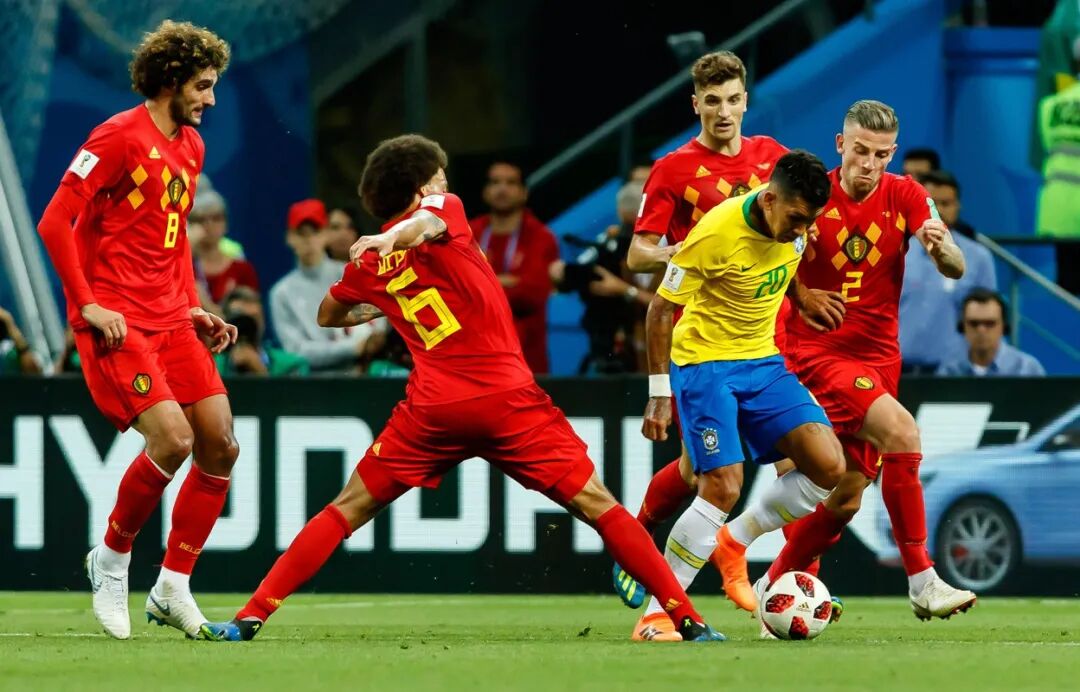 2018年世界杯四分之一决赛,比利时(红色球衣)战胜巴西。来源:TF-Images/Getty