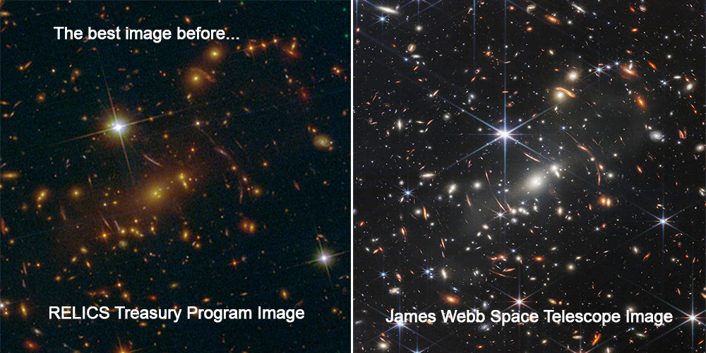 图 2:韦布望远镜的第一张全彩色图(右),对比于哈勃望远镜在同一区域拍摄的图像(左),图片来源: NASA/ESA/CSA/STScI