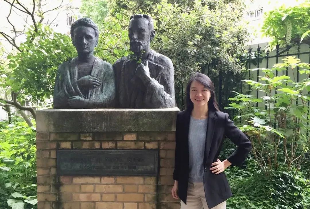 图4 2016年5月,曾艺在巴黎的居里研究所做演讲,和居里夫妇塑像合影,觉得儿时的梦想实现了。