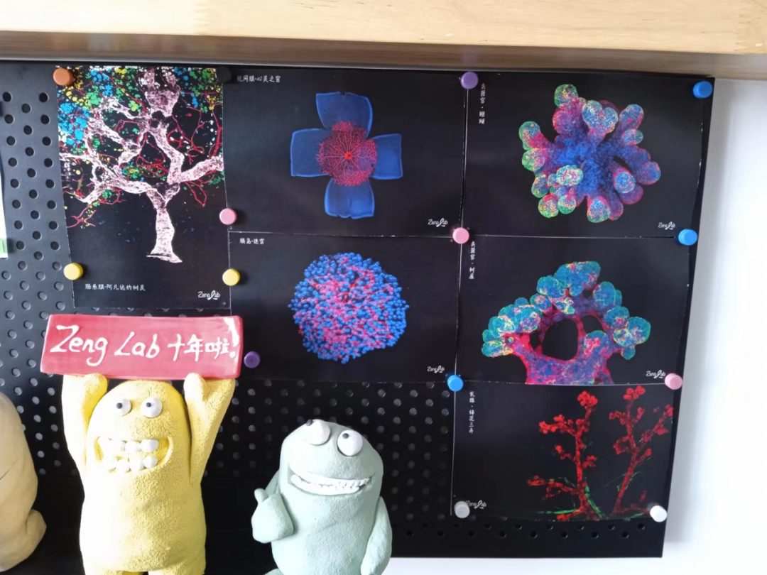 图3 在曾艺办公室的墙壁上,挂着各种类器官的图片,中央蓝色圆球为胰岛类器官 | 邸利会/摄