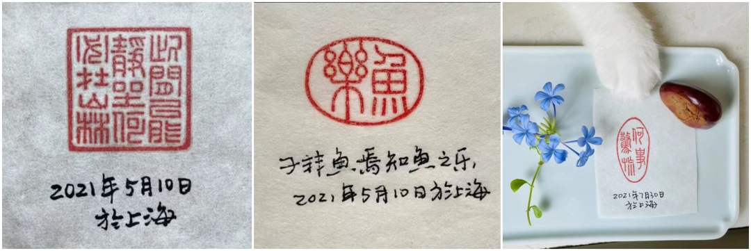 如果创作欲来了,曾艺会埋头伏案,握石执刀,有时一刻就是几个钟头。篆刻这门看起来有点冷门的技艺,是她2010年回国后 “半路出家” 自学的,用她的话说,“网上买了套工具直接就上手了。”她对自己的手始终很自信。譬如,有时候学生做不成实验,她会过来 “激” 他们一下—— “难道非要我出手吗,我来我肯定行”。这话说出口的时候,连她都不知道哪来的这种自信。在曾艺的办公室里,我见到了其中一些作品。这些闲章,少数自己留着,大多数直接送人。如这枚镌刻着 “何事惊慌” 的梅花章,送给了实验室一位处于 “人生转折点” 的博士后;又比如这枚 “鱼乐”,送给了一位名字里有 “鱼” 的学生。