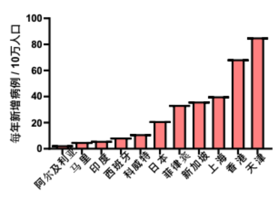 那么,用严谨的肺癌发生率这一指标来衡量,东亚人群中不吸烟者的肺癌发病风险是不是的确比其他地方高呢?