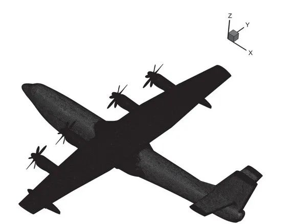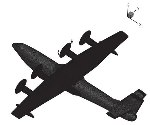 对于复杂的全机构型,为降低网格生成难度,节省网格生成时间,我们使用非结构网格进行模拟,两种模型的全机表面网格见图1和图2。分别对机翼前缘、后缘、垂尾、平尾等容易发生流动分离的位置处进行网格加密,两个模型的网格量分别为 1300万和800万。在采用32核并行计算的情况下,两个模型计算每个工况的时间分别为24小时和2.5小时。由此,得到的流场结构比较精细,可用于改善尾翼的设计。
