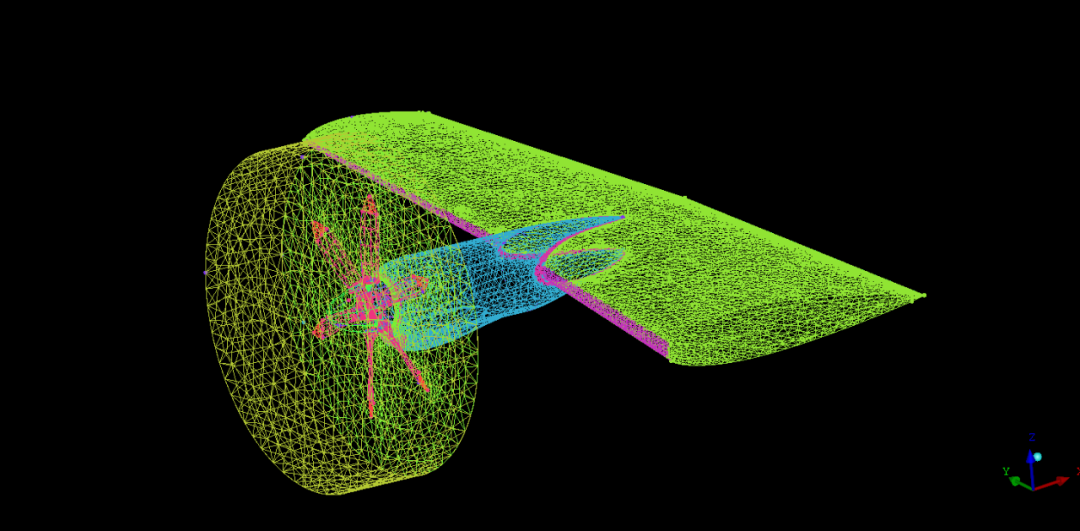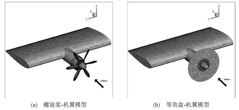 现在已用的简化办法,是采用具有压力差的“盘面”代替。螺旋桨-机翼模型、等效盘-机翼模型的几何及网格划分为了反应气流经螺旋桨后的扭转,再在盘面加上沿盘面旋转的切向速度差——涡盘。这就是所谓“等效扩展盘”的模型,如今它已经被实际应用,但仅适用于( 0~5度)机翼小攻角。攻角大了,机翼对螺旋桨周围气流的影响就不能忽略。为了解决这一问题,我们将“盘面”上的均匀压力差和涡度换成“非均匀”但有一定的分布规律。规律中的参数由真实机翼表面上的流场分布来确定,即数据驱动。