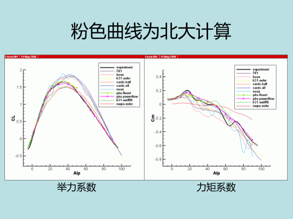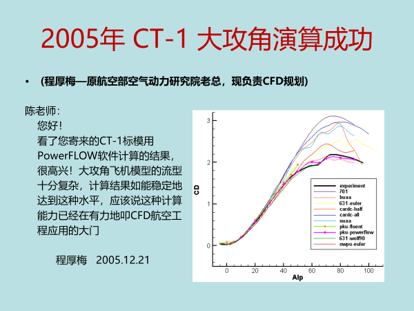 这是一个超大攻角飞机计算的难题,攻角要求算到105度。我们先组织两组,同时用 NS方程计算。攻角都算到45度就上不去了(按50度设置,不收敛)。于是改用LBM计算,收敛了。powerFLOW是一份基于LBM的流体计算软件。它在计算有分离的流动和计算噪声方面非常成功。高档汽车的气动设计都用它,而没有在飞机气动计算上用过,我们这次是首次。2005年6月底,我组派王一伟带了NS方程算到攻角45度和LBM算到攻角105度的两根曲线去参加评比。各家将自己计算的曲线交给秘书,开会那天,由秘书在开会时统一发布: