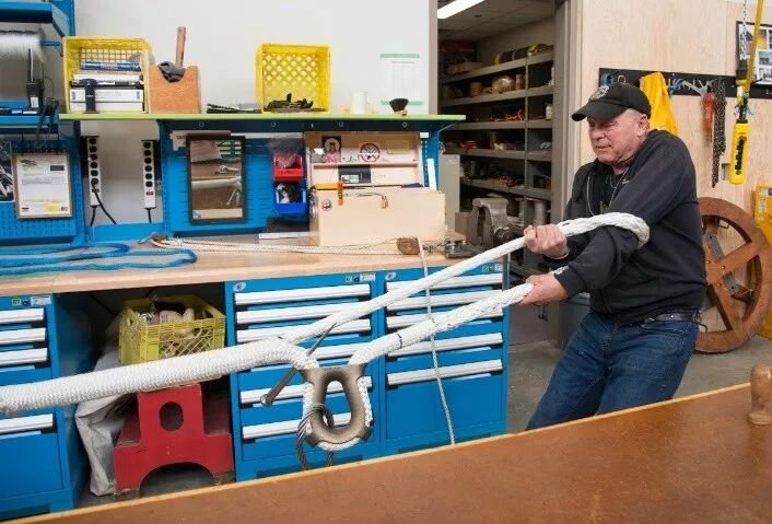 像特里•谢弗这样与绳子和绳索打交道的专业技术工种仍有很大需求,图为在不列颠哥伦比亚省维多利亚市加拿大海军造船厂工作的谢弗。“绳子和绳索是一种日常生活中最常见的东西,也正因为它太过平常而让人们忽略了它的价值。但是,如果绳子被拿走,你就会注意到。绳索和绳结是文明的基石,它们遍及我们世界的各个方面。”波森说道。环顾四周,我们仍然穿着带绳子(鞋带)的鞋子,我们的衣服、床单、窗帘、地毯和桌布都是用线绳织成的,我们的手机、电脑、烤面包机、搅拌器和电视在很大程度上仍然要依赖于传输电子信号的纤维束(电缆)。在我们的头顶上,电线、电话线和光缆从一个电线杆延伸到另一个电线杆;更不用说将大陆相连的超过100多万公里的海底电缆,这是全球电信传输系统的水下部分。当一艘核潜艇在港口停泊时,无论它多么庞大、多么雄伟,仍然需要一些绳索作为系泊设备。尽管在过去几个世纪里,现代医学取得了惊人的进步,但外科医生仍然需要用针和线来缝合某些伤口。绳索甚至伴随着我们最先进的科学机器进入太空深处,为了让火星漫游者好奇号上的电缆更牢靠,美国宇航局(NASA)的工程师使用了古老的酒瓶结和缩帆结,这两个传统绳结被人类使用了几千年。