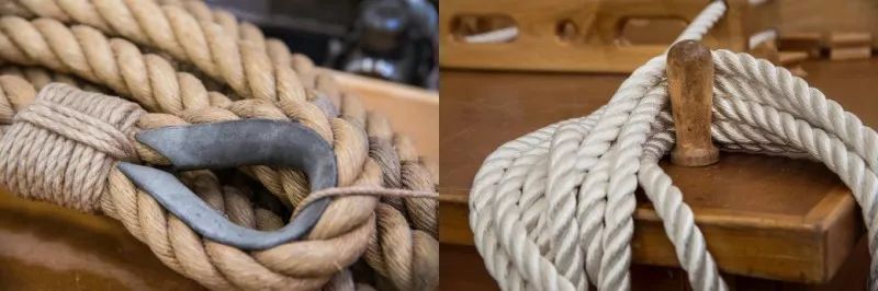虽然绳子和绳索的起源在陆地上,但却是海洋充分释放了绳索的潜在力量。最早的海上运输工具可能是用树枝或竹子绑在一起的筏子,还有用圆木挖空雕刻而成的独木舟,如1955年在荷兰高速公路建设中发现的一艘1万年前的皮斯独木舟。在人类航海的初期,唯一的水上交通推进方式是桨、杆子以及利用水流的作用。海上扬帆航行需要的关键因素是风,风可以像野生动物一样被捕捉、驯化和利用。人类用来驯化风的是桅杆和风帆,而桅杆和风帆实际上就是紧密编织起来的线绳网,可以用来捕捉风的力量。盘起来的长长的坚固绳索可以用来升起船上的风帆,绳索将海船从随波逐流的木头变成灵活的“牵线木偶”,它们由风推动,由人类的意志来操控。