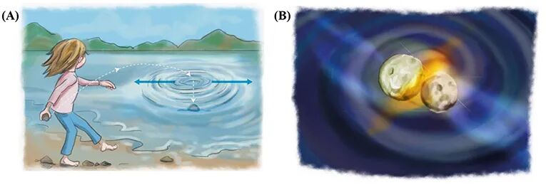 爱因斯坦的广义相对论的预言之一是,引力应该具有波动性——引力波[3, 4]。思考引力波的一个简单方式是,想象自己在一个静止的池塘边……然后你往池塘里扔一块石头。这块石头溅起了水花,然后掉到了池塘的底部。虽然石头现在静止在池塘底部,但你仍然可以看到它对水面产生的影响,即水波从中心向外运动(图3A)。这也是直观理解引力波的方法,只是形成引力波的不是那块落入池塘的石头,而是空间中大质量天体的运动或碰撞(图3B)。