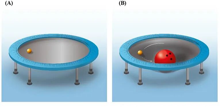 图2 根据爱因斯坦的引力理论。(A) 当你把一个弹珠放在一个平坦的蹦床上,它保持在原地。这代表了没有大质量物体存在时的空间状况。(B) 当你把一个重的保龄球放在这个蹦床的中间,蹦床变成卷曲的。如果你现在把弹珠放在蹦床上,它将向中心运动。这代表了爱因斯坦模型中的引力,一个大质量的物体(如恒星)卷曲了空间和时间,因此吸引其他物体(如苹果,或你自己)。