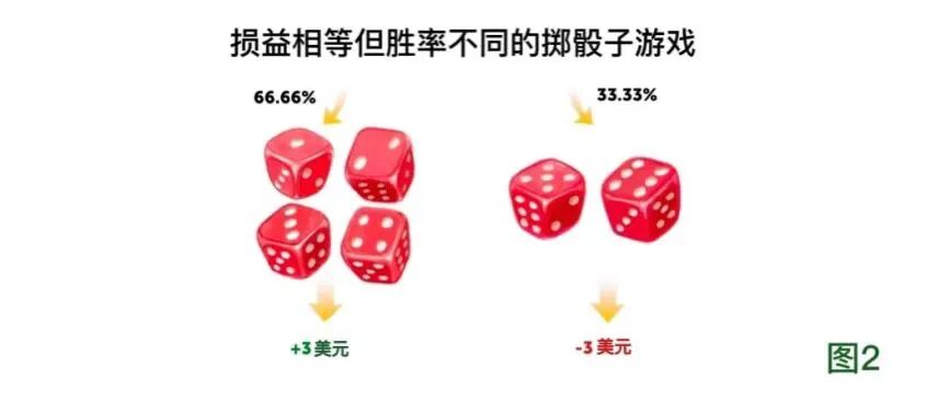 图2 损益相同但胜率不同的掷骰子游戏。在本游戏中,掷出1-4点中的任意点数,则得到3元(如左图);掷出5点或6点,则失去3元(如右图)。你愿意玩这个游戏吗?