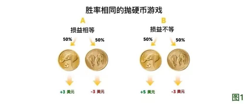 想象一下,你的朋友邀请你玩下面这个游戏:她负责抛硬币,你来猜测硬币落下后哪一面朝上。如果硬币正面朝上,你就得到3元;如果反面朝上,你就输掉3元。在这种情况下,收益和损失一样多,并且两种结果发生的概率都是50%,因为硬币只有两个面。你会选择玩这个游戏吗?再假如你的朋友改变了游戏规则,硬币正面朝上则你得到5元,反面朝上则你输掉3元呢?在这种情况下,收益和损失的金额是不一样的,但每种结果发生的概率还是50%(如图1)。