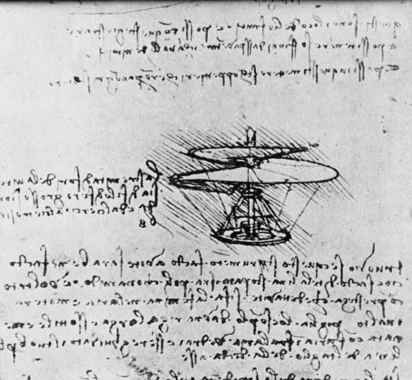 达芬奇写道:“空气螺旋桨的外侧边沿是一根粗线缆,最大半径大约为4米。为了正确地制造这台器械,你需要使用上过浆的亚麻布,那样空气不会穿透。假如它旋转得够快,这台机器会像螺旋桨一样旋转,穿入空气,然后它会升起来。”