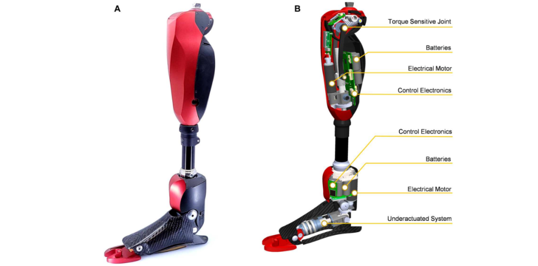 最近,美国犹他大学机械工程系 Tommaso Lenzi 团队设计出一种符合人体力学的轻便假肢 Utah Bionic Leg。该假肢整体被坚固紧凑的7075-T6 铝合金薄板包裹,由相对独立的膝盖模块(40g)和脚踝/脚趾模块(70g)组成,并匹配了与微处理器控制假肢 Ottobock C-leg 相似的重量、大小和电池。其中的膝关节运用扭矩敏感机制,将弹性致动器和变速器的优点进行了有机结合;在人正常行走过程中,脚趾消耗能量,而脚踝能周期性产生并注入能量。Utah Bionic Leg 的踝/脚复合体运用欠驱动系统完美复制了人体脚踝/脚趾的该项关键生物力学功能。如果选择被动模式,使用者可在平坦地面上持续行走,无需给Utah Bionic Leg充电。3名截止患者参与的临床前试验表明,使用Utah Bionic Leg产生的活动效果和正常行走水平已比较接近。