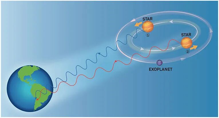 任何类型的波都遵循这一规律,包括光。因此,当像恒星这样的发光物体向我们移动时,它的光谱将会向短波长、高频率移动(称为蓝移),而当它远离我们时,光谱会向长波长、低频率移动(称为红移)。而当行星围绕着恒星运行时,行星的引力会影响恒星的运动——恒星沿着由行星轨道引起的椭圆轨道运动,所以恒星有时候向地球移动,有时候远离地球。恒星相对于地球运动方向的变化会引起恒星光谱线的变化。总的来说,这意味着我们可以通过测量恒星光谱线的多普勒频移,来间接推断出围绕恒星运行的行星的存在(图2)。
