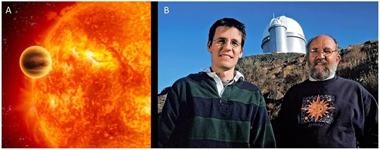 图4 (A)飞马座51b系外行星(小球体)和它所环绕的恒星的艺术表现图。飞马座51b是一颗气态行星,距离地球约50光年。它是我们在太阳系外发现的第一颗围绕类太阳恒星运行的行星。(B)我的同事迪迪埃·奎洛兹(左)和我站在智利拉西拉天文台的3.6米HARPS望远镜前。自2003年以来,HARPS望远镜就搭载了我们开发的互相关技术,用来搜索系外行星。[图源:NASA/JPL-Caltech(A)和L. Weinstein/Ciel et Espace Photos(B)。]