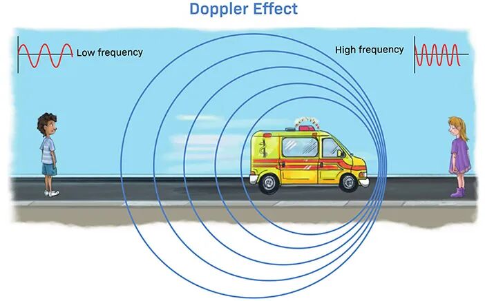 图1 多普勒效应。当一辆救护车鸣笛向你(右边的人)驶来时,警报器的声音比它远离你(左边的人)的时候更快地到达(频率更高)。这种效应是从观察者的角度看到的频率变化。警笛声的频率实际上没有变化。
