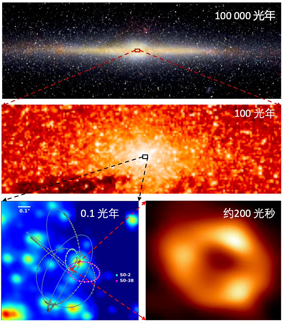 或许有读者会问,超大质量黑洞具有强大的引力,在距离黑洞如此近的恒星轨道上,仅使用牛顿力学计算出的黑洞质量是否准确,是否需要引入爱因斯坦的广义相对论呢?事实上,S0-2的轨迹确实为验证广义相对论提供了一次很好的机会。但是如果我们只关注黑洞质量的测量,即使对于S0-2,在完全不考虑相对论效应的情况下、根据牛顿力学计算黑洞质量仅会导致约10%左右的误差,而对于更远处的恒星,广义相对论效应更加可以忽略不计了。 图3:银河系中心黑洞周围恒星的运动轨迹,蓝色和紫红色的点标记的是离黑洞最近的两颗恒星S0-2 和S0-38。图片来源:S. Sakai/A.Ghez/Keck Observatory/UCLA Galactic Center Group