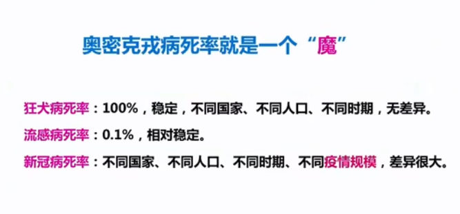 在这段视频的22分35秒,吴博士提出“奥密克戎的病死率就是一个魔鬼”,理由是它在不同国家、不同人群、不同人口、不同疫情规模差异很大,不像狂犬病毒和流感病毒那样相对稳定。