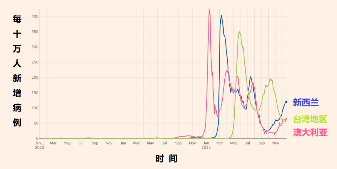 让我们再看看现实世界的情况,我们看看那些和中国一样采取了严格防控措施,但后来在疫苗接种普及后放开的国家或地区:澳大利亚、新西兰和中国台湾地区。