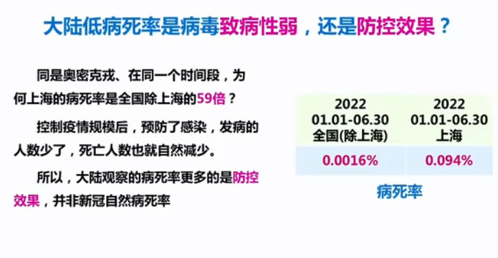在接下来视频中的18分30秒,吴博士提到今年1到6月份上海的新冠病毒病死率是国内其他地方的59倍,并对这个差异的原因进行了解释。他认为“是其他地方的疫情防控的好,预防了很多人的感染,而没有感染的人则不可能因为新冠死亡,因而把病死率降下来了。”