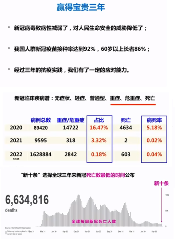 在吴博士看来,此前我们严格的防疫政策为抵抗新冠病毒赢得了宝贵的三年时间。而在经历了三年的疫情后,新冠病毒的致病性减弱了,我们疫苗接种率达到了92%,同时我们对这种传染病也有了一定的应对能力。