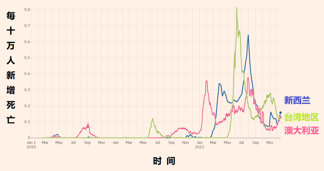 澳大利亚、新西兰和中国台湾地区的新冠疫情死亡病例走势图 (图源:参考链接6)
