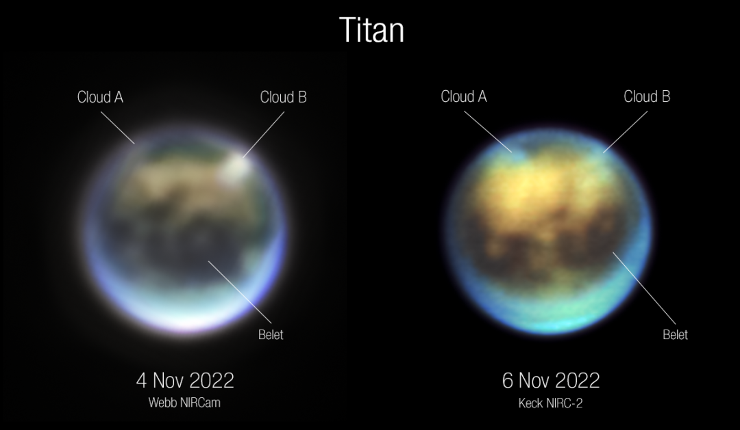 2022年12月1日,韦布又发布了一组重要的图像,土星的“月亮”——土卫六(Titan)。韦布上的近红外相机NIRCam等仪器通过对土卫六的拍摄,能够清晰地辨认出土卫六上的云层(Cloud A和Cloud B)随时间的推演而移动。随后的分析也确认土卫六上的克拉肯海(Kraken Mare)是一个甲烷海,贝莱特(Belet)则是一个深色的沙丘。看来土星的月亮要比咱们地球的欢实多了。
