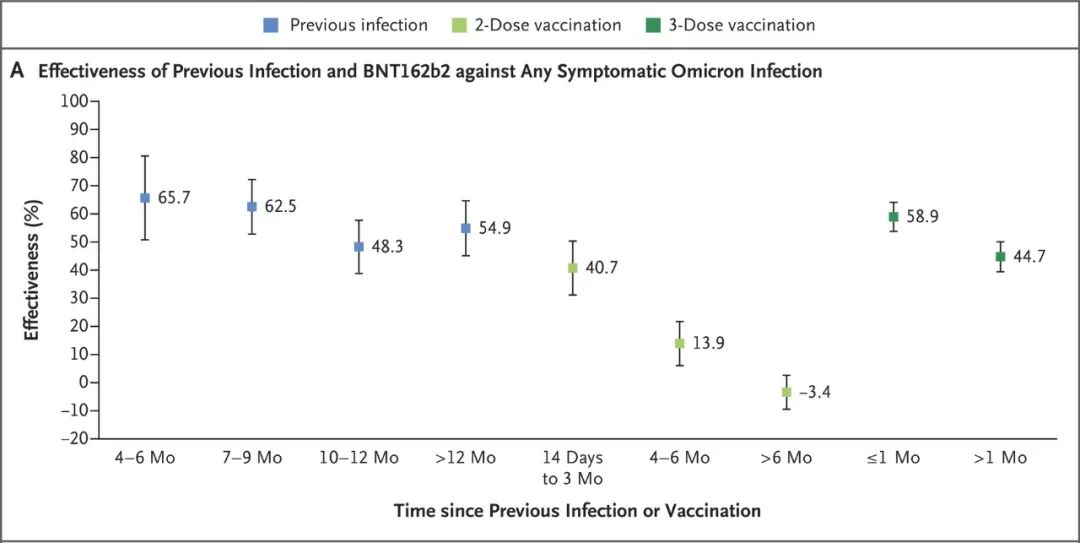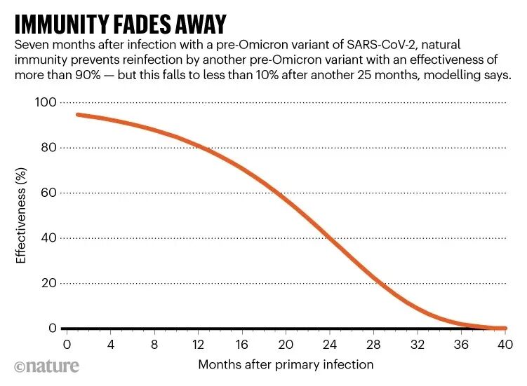 在今年的Omicron变异株流行期间,该团队也得到了类似结论:初次感染能较好预防再次感染和再次感染重症的发生。据估计,初次感染预防omicron(B.1.1.529)变异株再感染的效率是56.0%,预防重症的效率是87.8%(Omicron)[6]。但需要注意的是,原始毒株初次感染对两年后出现的Omicron的BA.4或BA.5亚变异株的再次感染(2022年6月8日至7月28日间)保护效率已经下降到27.7% [7]。图2. SARS-CoV-2感染所诱导产生免疫力的下降情况[8]