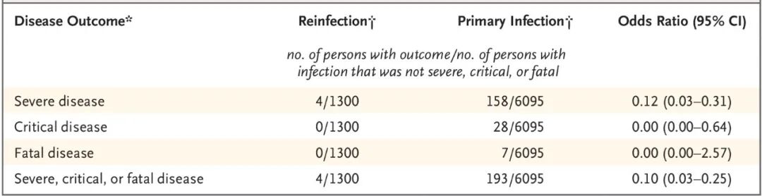 表1. 卡塔尔人群中,与SARS-CoV-2初次感染相比,再次感染的严重程度[5]