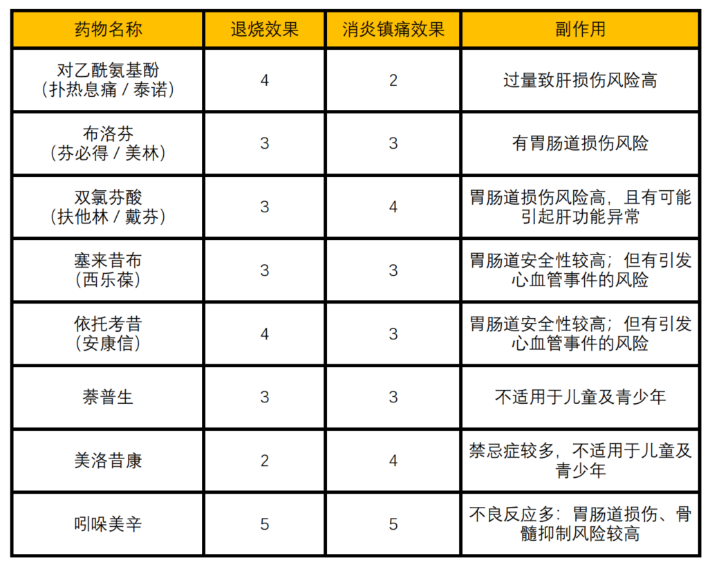 图2:市面上常用的非甾体类抗炎药及其分类、用药注意事项今天主要介绍一下市面上最常见、也是目前大家首选的两种应对新冠的退烧止痛药:布洛芬[14,15]和对乙酰氨基酚[16,17]。布洛芬,又名异丁苯丙酸,以商品名“芬必得”为大众所熟知。布洛芬集止痛、退烧、消炎功能于一身,是目前市场上使用最为广泛的非甾体类抗炎药(NSAIDs)。布洛芬由丙酸衍生得到,最初作为阿司匹林的安全替代品而被研发出来,是历史上第一款非处方(OTC)的非甾体类抗炎药(NSAIDs)。作为非选择性COX抑制剂,其能有效抑制中枢系统中COX-1和COX-2的活性,减少前列腺素的合成,从而达到抑制疼痛、发热和急性炎症的目的。需要注意的是,布洛芬对COX-1的抑制也会带来包括消化道溃疡在内的一系列副作用。而另一种常用退烧药对乙酰氨基酚,常常并不以其本名示人。对乙酰氨基酚俗称扑热息痛,或以泰诺等商品名为大家所熟知。对乙酰氨基酚是一类广泛使用的解热镇痛药物,既可以单独成药,也常与其他药物联合,出现在超过六百种非处方(OTC)过敏药物、感冒药、安眠药和止痛药中。对乙酰氨基酚直接作用于大脑的中枢神经系统,通过抑制体温调节中枢内COX-2的活性,从而抑制前列腺素的合成与释放,达到下调下丘脑体温调定点、促进身体散热并降低体温的目的。前列腺素也是引起疼痛感觉的主要原因,因此对乙酰氨基酚在降低体温的同时也可以起到抑制身体疼痛的效果。 可见,布洛芬对中枢COX酶的广谱抑制效果更加广泛,而对乙酰氨基酚则更注重抑制参与发烧过程的COX-2。不同的机制带来不同的效果——布洛芬的镇痛效果要略胜对乙酰氨基酚一筹,而在退烧效果上,则是对乙酰氨基酚拔得头筹。图3:止痛神药布洛芬(左)与退烧首选对乙酰氨基酚(右)的结构式虽然在一定程度上,加大药物剂量能起到更快更强的退烧镇痛效果,但近期诸多因过度服用对乙酰氨基酚导致肝损伤疾病的新闻报道,向我们敲响了警钟。事实上,对乙酰氨基酚并不属于布洛芬所处的“非甾体类抗炎药”的范畴,不具有外周抗炎的作用,同时其在患者体内起效的过程中,会产生毒性较大的氧自由基和自由基代谢产物NAPQI(N-乙酰-对苯醌亚胺),而肝脏作为对乙酰氨基酚主要的代谢部位,则成为了这类毒性物质的主要攻击目标。我们知道肝脏是机体内最强大、最重要的解毒器官,然而再强大的器官也有其能力上限。如果过度服用对乙酰氨基酚时,上述氧自由基的形成便会远超肝细胞的解毒功能,致使肝细胞损伤甚至死亡,从而诱发急性肝衰竭[18]。正如前文所提,对乙酰氨基酚是各类西式感冒药的组分常客。因此,当我们因各种原因选择将几种感冒药混吃的时候,切记检查其中是否都含有对乙酰氨基酚成分,因为稍有不慎,过量摄入的对乙酰氨基酚就会从新冠病毒的抵抗者变为肝脏的无情杀手。新冠固然可怕,但我们在服药时也需时刻牢记“是药三分毒”的道理,尤其是药物本身的剂量效应,以及多种药物联用时可能出现的副作用,都是会令患者倒在战胜新冠的胜利前夜的潜在危险。在缺少翔实的药物服用知识基础时,仔细阅读药物说明书、咨询医师、网络问诊等都将是确保用药安全的有效途径。在布洛芬和对乙酰氨基酚热销乃至时常脱销的当下,很多类似的消炎镇痛药物也受到患者的关注。吲哚美辛、双氯芬酸等非甾体类抗炎药均具有很强的抗炎、镇痛和退烧效果,但正如布洛芬和对乙酰氨基酚之间的差异一样,不同药物针对抗炎镇痛或退烧降温的侧重点有所不同,同时其也会带来各种各样的副作用。因此在选择用药时,一定要结合自己当下的疾病发展状态(例如以退烧为先还是止痛为先)和既往病史(是否有心血管问题、是否胃肠道较为脆弱等),综合判断,以达到最好的治疗效果。