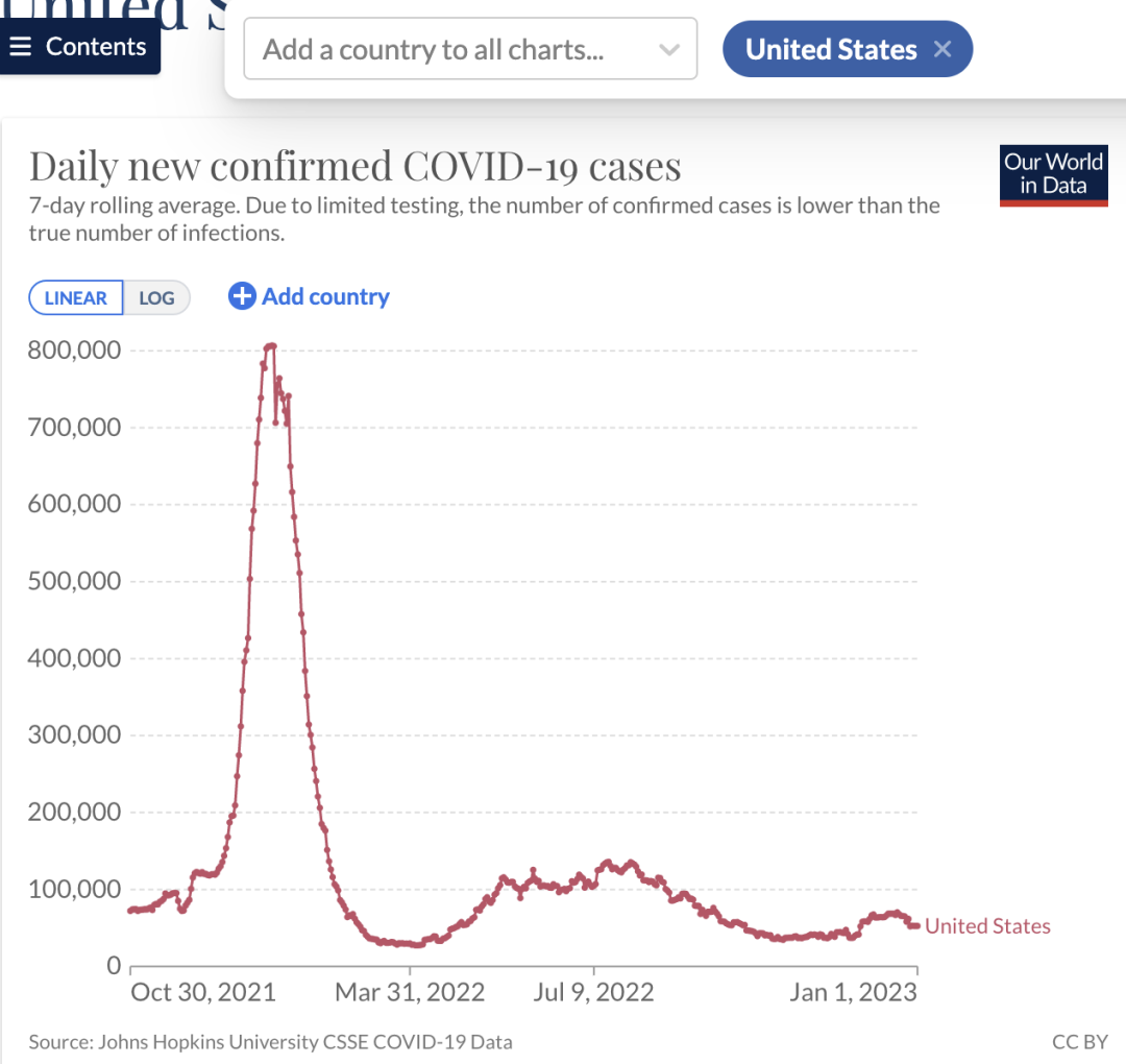 杨庆来则利用数据为此做出了补充:“目前,虽然XBB.1.5占感染总数的40%,但全美总感染人数日增平均不到10万,而在去年1月的奥密克戎第一波大海啸期间,日增感染数字几乎有80万-100万,这中间,有着数量级上的差别”。