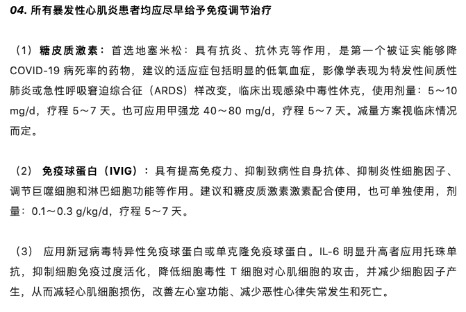 同样在新冠并发症领域,清华长庚此前于 1 月 5 日发布了《新冠感染相关性心肌炎简明诊治建议》,提到,所有暴发性心肌炎患者均应尽早给予免疫调节治疗,其中就包括 IVIG。