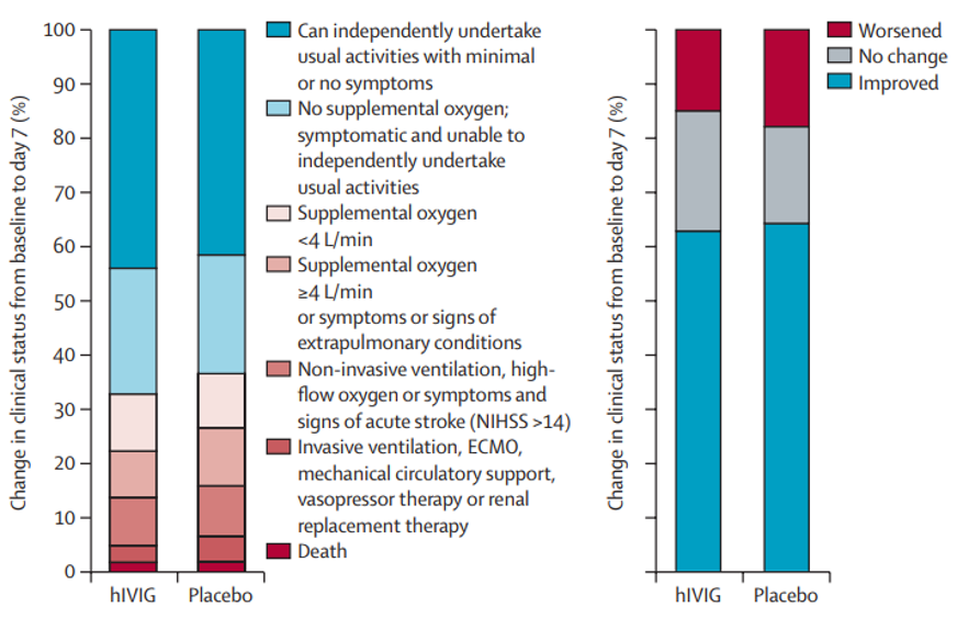 接受超免疫球蛋白(hIVIG)或安慰剂(Placebo)的患者在治疗第 7 天时的病情严重程度(左)和病情改善状况(右),结果显示超免疫球蛋白的疗效与安慰剂无异,图源:参考资料[6]
